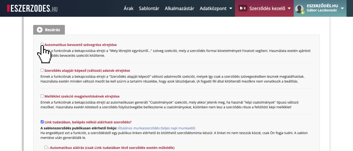 A Haladó beállítások lenyitásával az alábbi opciók közül választhat: Automatikus bevezető szövegrész elrejtése Elrejti a „Mely létrejött egyrészről…” kezdetű, formai bevezetőt; használatakor javasolt a szerződés bevezetőjét kézzel kitölteni.