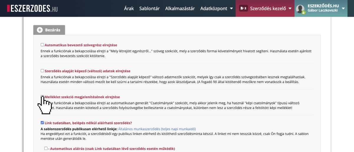 Melléklet szekció megjelenítésének elrejtése Elrejti a „Csatolmányok” blokkot, amikor képi mellékletet használ; ebben az esetben a képeket kötelező a szerződés folyószövegébe beilleszteni.