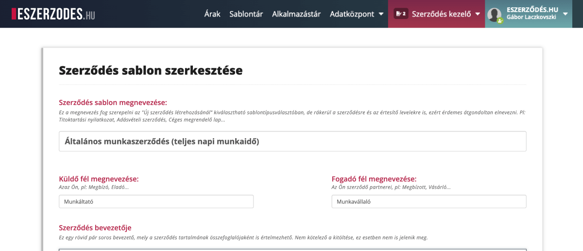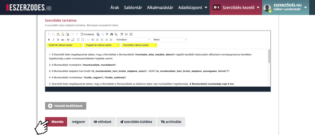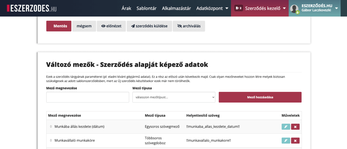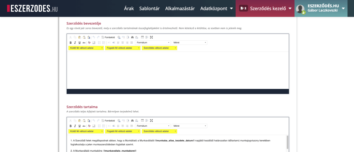 A változó mezők a szerződés tartalma felett jelennek majd meg alapértelmezetten és ezek a változó mezők teszik egyedivé a sablonból generált szerződéseket (ilyen például egy munkaszerződés esetén a Munkavállaló munkaköre, alapbére). Ezeket a mezőket kötelező kitölteni a létrehozónak vagy a szerződés aláírás előtt valamelyik félnek, így biztos lehet abban, hogy nem maradnak kitöltetlenül fontos adatok.